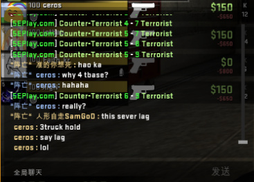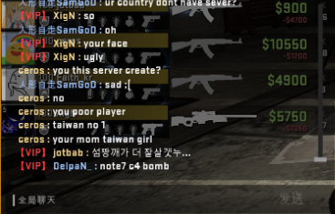 之后,依旧是在暂停时间,但是双方玩家开始了不理智的互相对骂。CT方的中国玩家甚至以为对手并不是韩国的职业战队MVP的选手,认为MVP选手的素质很高,当然他们错了。但是XigN,ceros以及Fatih_kr的嘲讽一波接着一波(甚至包含了淫秽词语),具体看图。我承认中国玩家在这上面输了,输出完全不足。