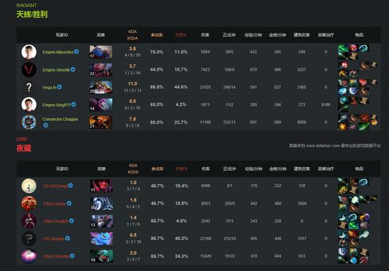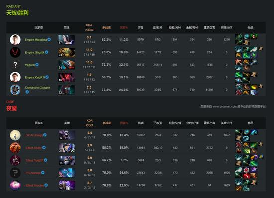 不过帝国在这场比赛中有点轻视了对方熊德的个人能力,Sedoy的绝活德鲁伊是Effect这场比赛的翻盘关键。比赛第15分钟经济领先的帝国战队主动开雾进入对方野区并先手到了德鲁伊,然而被及时TP的暗牧用薄葬救下,帝国再转火却发现自己的减甲流在斯文和暗牧的加甲面前毫无输出,再配上此时已经小电锤魔龙枪的熊德的输出,Effect直接一波0换4将局势彻底反转。随后Effect打盾上高,两波推高攻势破掉了天辉中路兵营,但帝国付出了三人买活的代价后利用暗牧没给熊德薄葬的失误击杀了德鲁伊老鹿双大哥,成功的挽回了一些局势。随后帝国趁胜追击,再次利用德鲁伊发育的空当入侵夜魇野区并打出一波1换4。但之后帝国再次开雾就没这么成功了,Effect在高地破雾并摆好阵型严阵以待,帝国虽然打出先手,但是阵容只有物理输出没有魔法爆发的问题在此刻凸显了出来,Empire不仅没有击杀对方任何人,反而被熊德和老鹿的高输出击杀了蚂蚁和大鱼,随后Effect两波开雾连续带走对方数人,帝国再也无力抵挡打出GG。