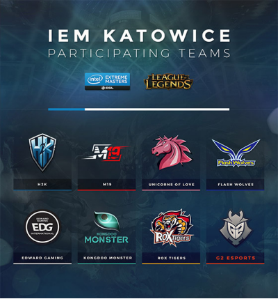 2月14日,IEM主办方正式宣布:欧洲战队G2即将顶替北美劲旅C9,参加本月22日开始的IEM卡托维兹总决赛。至此,英雄联盟项目的8支参赛队伍名单得到了最终确定,它们分别是: