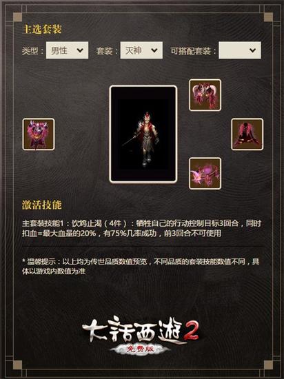 “灭神”套装由衣、面具、披风、腰带组成,技能为饮鸩止渴(4件):牺牲自己的行动控制目标3回合,同时扣血=最大血量的20%,有75%几率成功,前3回合不可使用。