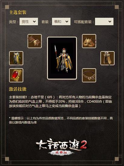 “羲和”套装由帽、衣、面具、武器、披风 腰带组成,技能为赤地千里(6件):将对方所有人物的当前剩余血量指定为他们临时的气血上限,不得低于20%,持续3回合,CD40回合(即施放该技能后对方气血上限马上变成当前剩余血量)。