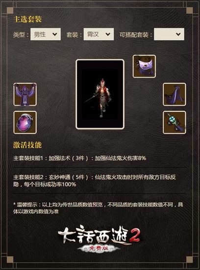 大话2免费版资料片《仗剑伏魔》推出39套炫美套装,引战力升级!今日,为大家介绍霄汉、天荒、寒鸦、太皓、洞天、雅声、灭神、破军、容止、断鬼、大觉、羲和、毗卢、寒隐、九曜、燃灯等16套男性套装(以上均为传世品质数值预览,不同品质的套装技能数值不同,具体以游戏内数值为准)。
