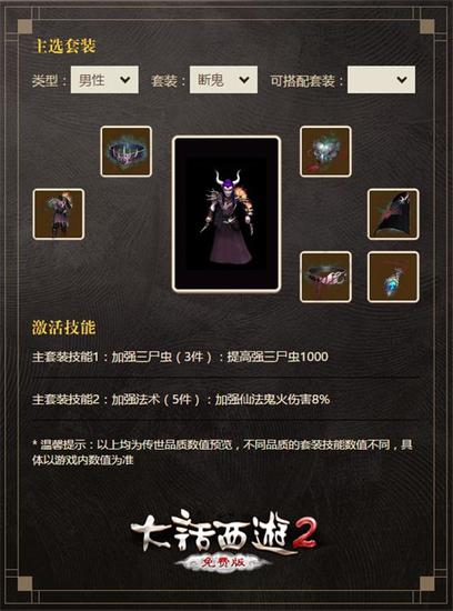 “断鬼”套装由帽、衣、面具、披风、挂件、腰带组成,可改变角色外观,技能为加强三尸虫(3件):提高强三尸虫1000;技能2为加强法术(5件):加强仙法鬼火伤害8%。