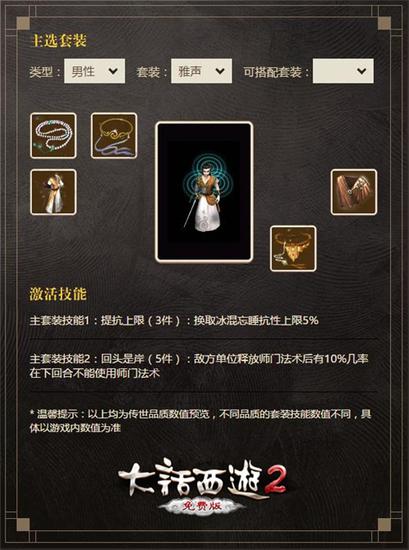 “雅声”套装由帽、衣、项链、披风、腰带组成,可改变角色外观,技能为提抗上限(3件):换取冰混忘睡抗性上限5%;技能2为回头是岸(5件):敌方单位释放师门法术后有10%几率在下回合不能使用师门法术。