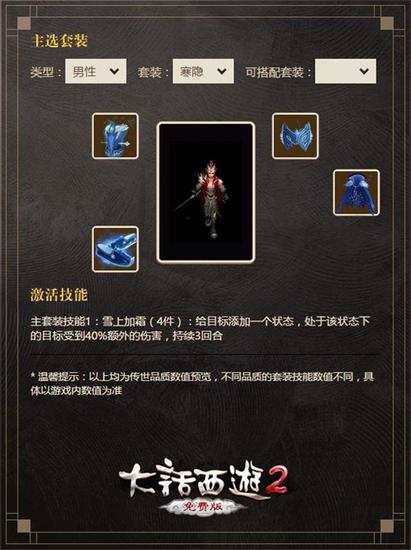 “寒隐”套装由帽、面具、鞋、披风组成,技能为雪上加霜(4件):给目标添加一个状态,处于该状态下的目标受到40%额外的伤害,持续3回合。