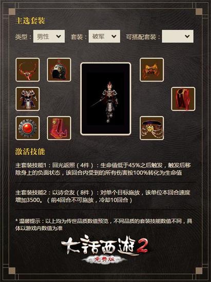 “破军”套装由帽、衣、项链、面具、鞋 武器、披风、腰带组成,技能1为回光返照(4件):生命值低于45%之后触发,触发后移除身上的负面状态,该回合内受到的所有伤害按100%转化为生命值;技能2为以诗会友(8件):对单个目标施放,该单位本回合速度增加3500(前4回合不可施放,冷却10回合)。
