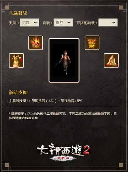 “燃灯”套装由帽、衣、面具、披风组成,技能为忽视抗混(4件):忽视抗混+5%。