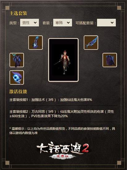 “寒鸦”套装由帽、衣、面具、武器、披风组成,技能为加强法术(3件):加强仙法鬼火伤害8%;技能2为万古同悲(5件):仙法鬼火附加灵性相关的伤害(灵性≥600生效),PVE伤害效果下降为20%。