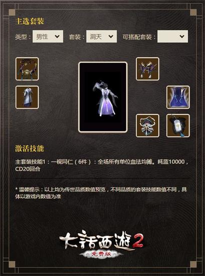 “洞天”套装由衣、项链、面具、披风、挂件、腰带组成,可改变角色外观效果,技能为一视同仁(6件):全场所有单位血法均摊,耗蓝10000,CD20回合。