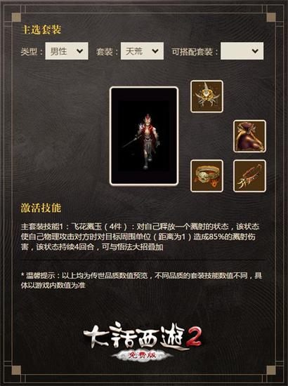 “天荒”套装由面具、披风、挂件、腰带组成,技能为飞花溅玉(4件):对自己释放一个溅射的状态,该状态使自己物理攻击对方时对目标周围单位(距离为1)造成85%的溅射伤害,该状态持续4回合,可与悟法大招叠加。
