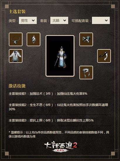 “太皓”套装由帽、衣、项链、面具、披风、腰带组成,可改变角色外观效果,技能为加强法术(3件):加强仙法鬼火伤害8%;技能2为生生不息(6件):仙法鬼火伤害按照出手次数循环递增30% 。