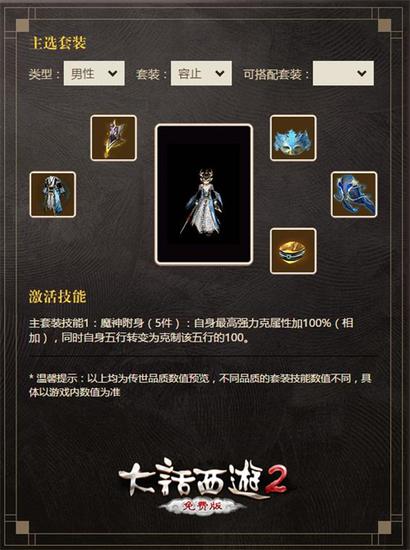 “容止”套装由帽、衣、面具、披风、腰带组成,技能为魔神附身(5件):自身最高强力克属性加100%(相加),同时自身五行转变为克制该五行的100。