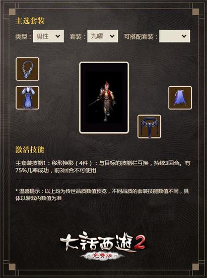 “九曜”套装由衣、项链、披风、腰带组成,技能为移形换影(4件):与目标的技能栏互换,持续3回合。有75%几率成功,前3回合不可使用。