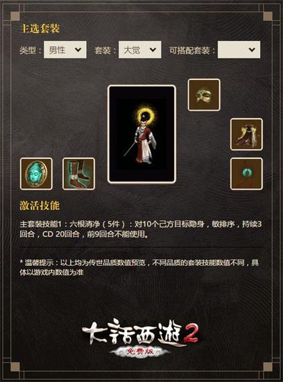 “大觉”套装由面具、鞋、武器、披风、挂件组成,可改变角色外观,技能为六根清净(5件):对10个己方目标隐身,敏排序,持续3回合,CD 20回合,前9回合不能使用。