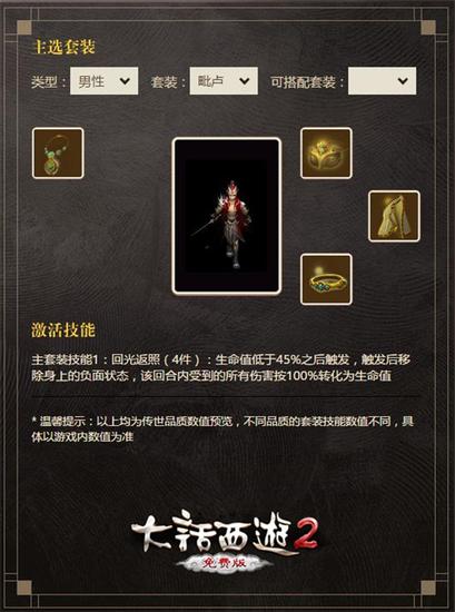 “毗卢”套装由项链、面具、披风、腰带组成,技能为回光返照(4件):生命值低于45%之后触发,触发后移除身上的负面状态,该回合内受到的所有伤害按100%转化为生命值。