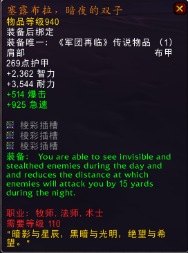 装备:你能够在白天看到隐身和潜行的敌人,并在晚上使敌人能够攻击你的距离降低15码。