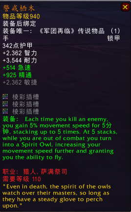 装备:每次你杀死敌人使你获得5%的移动速度加成,持续5分钟,最多叠加5次。达到5层时,你能够在脱离战斗时变为灵魂猫头鹰,进一步提高移动速度,并且能够飞行。