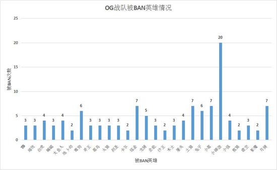 当然,我们也不能单纯从选人情况来分析OG战队选人套路,因为更多的绝活英雄已经被对方BAN掉了。OG战队在28场比赛中,被对手BAN掉了45个英雄。其中小娜迦被BAN了20场,这也是为什么OG战队只使用过一次小娜迦的原因。