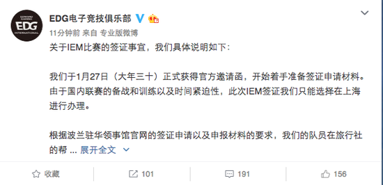 EDG官方微博刚刚发布了关于IEM比赛签证事宜的回应文章。原文如下: