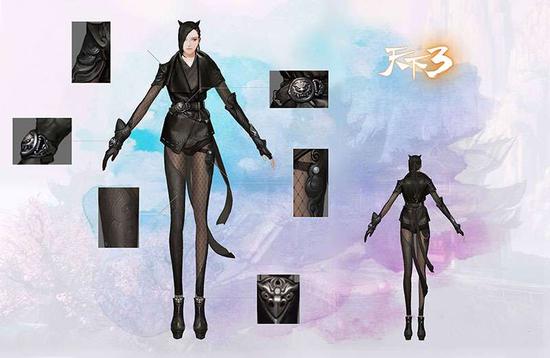 此套时装的女装有“黑夜妖媚”之称,与男装的貔貅加身不同,女装以银器鹰隼为护身物,皮衣裹挟黑丝长袜,穿上一双8.6厘米的黑色高跟更显身材高挑诱人。穿上这套时装便是你高冷的选择,但转身回眸一笑时却能使苍生无穷回味而心中百媚丛生!美术对这套时装的配置细心入微,以至于头顶还有一副小恶魔角点缀了高冷中的俏皮与性感。