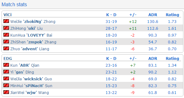 uki归队表现出色下半场EDG赢下手枪局,但第二局zhokiNg完成四杀帮助VG翻盘,随后VG连得3分取得14-6领先。EDG直到第21局才艰难拿到第7分,VG经济不好选择强起,成功翻盘后15-7领先手握8个赛点。EDG挽救了3个赛点之后仍以10-16负于VG,跌入败者组。重回VG阵容的uki全场拿下28个frag,仅次于zhokiNg的31个,表现出色。