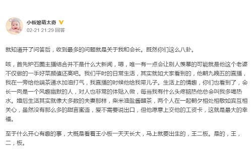 祝愿板娘会长幸福绵长,恩爱永远,在傻屌的路上坚持到底!最后恭喜板娘夫妇以及王小板马上要成为哥哥了,同时还要恭喜军师们即将有机会再次参与王二板起名计划。王二板究竟是男孩还是女孩?让我们一起期待宝宝的到来!