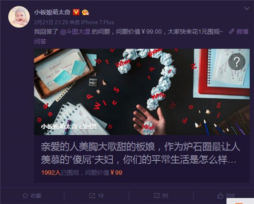 总是乐于研究新鲜事物的炉石小板娘最近又玩上了微博新发起的问答活动,并承诺一定知无不言言无不尽。热衷于八卦的军师们纷纷前来围观,万万没想到的是在结尾彩蛋中,板娘果然爆了一个大料,板娘家好事连连王二板要出生了!