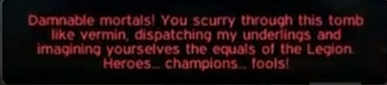 该死的凡人们!你们像害虫一样匆匆的进入墓穴,干掉了我的下属们,想象一下你们和军团不是一样么,愚蠢的英雄们…保卫者们… 你们面前的盔甲曾是萨格拉斯力量的化身。而这个泰坦圣殿也是我们的战利品。这意味着我们将吧你们的世界毁成渣渣! 当然……我不会剥夺你们在这个古代奇迹前惨败的机会。让这个化身了结你们!