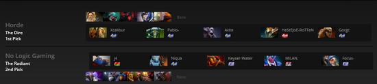 决赛第一场Horde选出了蚂蚁+TA的物理爆发流,加上兽王和小强的控制,AKKE则操刀他惯用的巫医;对手则以小鱼卡尔军团拉比克光法的阵容来应对。整场比赛的节奏从对线期开始就掌握在Horde的手里,英雄上的优势保证了小强兽王的发育,到6级以后两人的积极游走创造了很多机会,小鱼军团很难在团战中找到机会寻找对面酱油进行击杀;Horde稳步打盾上高,最终拿下第一局比赛的胜利。