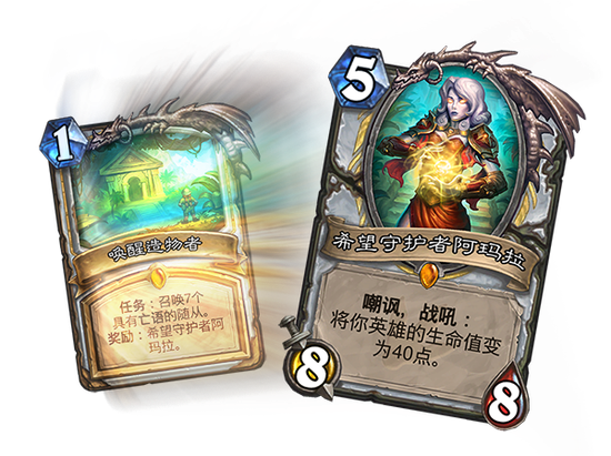 任务卡牌是《炉石传说》的全新卡牌类型。任务卡牌均为传说品质,因此每套卡组只能放入一张,并且它总会出现在你的初始手牌中。每张任务卡牌都有独特的要求条件,你必须满足所有条件才能完成任务。完成任务将会带来惊人的奖励!下面是牧师的任务卡牌“唤醒造物者”,以及完成后奖励的卡牌:希望守护者阿玛拉!
