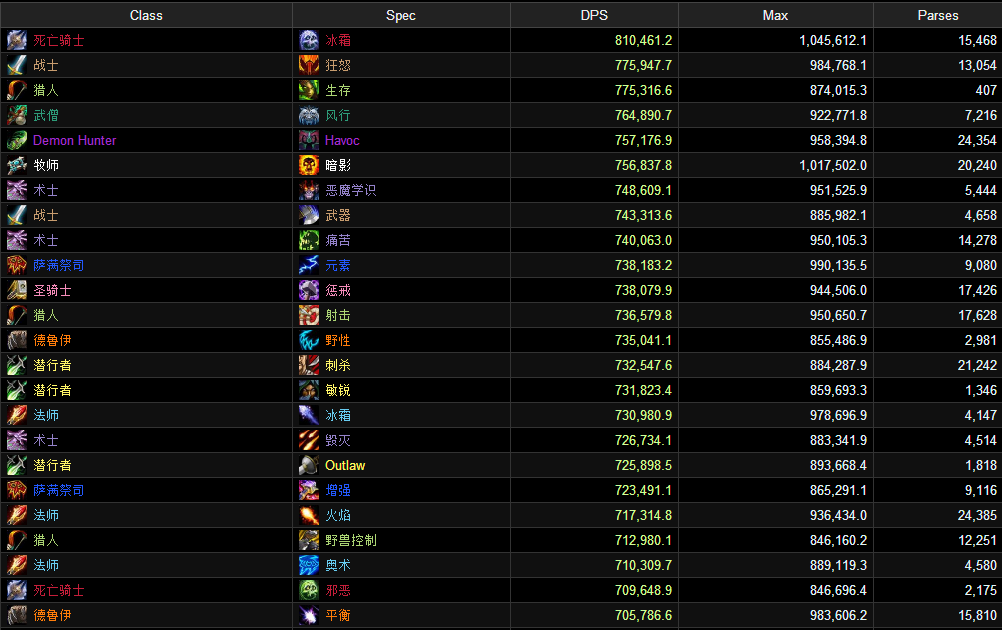 这是最新的暗夜要塞DPS综合排行,死亡骑士通过上次BUFF已经有了非常突出的表现,最后一名咕咕也有70WDPS,所有职业表现都没有太大差距。