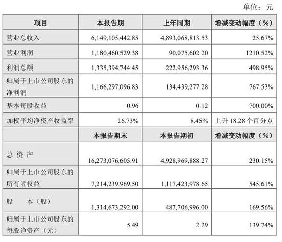 报告期内,公司实现营业收入 6,149,105,442.85 元,较上年增加 25.67%;实现营业利润 1,180,460,529.38 元,较上年增加 1,210.52%;实现利润总额1,335,394,744.45 元,较上年增加 498.95%;实现归属于上市公司股东的净利润1,166,297,096.83 元,较上年增加 767.53%;实现基本每股收益 0.96 元/股,较上年增加 700%。