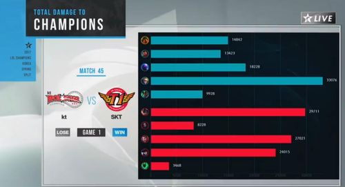 中期KT继续发力连拆SKT三路一塔,在26分钟KT领先SKT两座塔,而SKT有两条龙。三十分钟双方中路对决SKT团灭KT拿下大龙,局势扭转推掉下路高地塔。瑞兹开大绕后开团,KT不得不接战。SKT杀掉对面两人,直奔高地拿下水晶,恭喜SKT首局先胜。