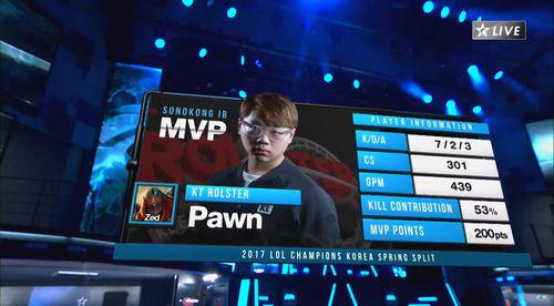 Pawn选择劫来打发条,前期发条压线太深让男枪绕后Gank拿下一血。前期KT一直找机会开小团并且快速拿三座外塔。17分钟KT已经超7千经济。KT一直逼近快速进攻,20分钟拿下一万经济。但是就在KT打完大龙准备再杀个泰坦,谁知Faker一个大招拉到四人团灭KT,SKT扳回一点经济。SKT多次阻止KT的进攻与大龙,但还是经济相差太大只能让KT再次拿下大龙。