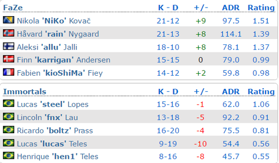 2017IEM卡托维兹A组第三场比赛是FaZe对阵Immortals。有NiKo加盟的FaZe在overpass这张地图上以16-6的比分轻松击败对手,拿下自己的首胜。