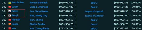 值得一提的是在这份榜单前50只有两名LOL选手,那就是Faker和Bengi。SKT双子星获得了三界S系列赛冠军,奖金远超其他LOL选手。