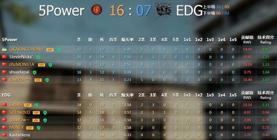 5Power在本次群星联赛中国区预选赛中一路走来表现都非常出色,本场比赛面对EDG的比赛对于他们来说至关重要。双方首先在cobblestone上展开争夺,5P先做CT赢下手枪局后取得5-0领先。