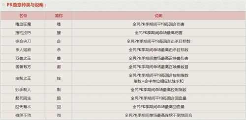 全民PK季期间,诸位玩家参与天梯比武以及水路大会的亮点数据将以PK勋章的形式记录在风云录之中,等级1转以上的玩家满足一定要求即可获得万兽之王、嗜血狂魔、控制之王、杀人如麻、起死回生、岿然不动、控制之王、夺命尖刀等PK勋章!PK勋章排行榜将每日数据,活动结束后,名号前20名玩家将获得时效称谓奖励!需注意的是,平均类数据勋章需要参加10场以上战斗方能获得。