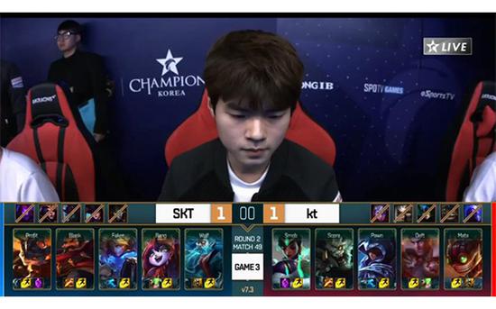 SKT放出青钢影给KT,自己选择鳄鱼进行counter。SKT上单Huni利用鳄鱼疯狂压制青钢影,但是Faker的中单飞机被维克托压制得多次回家补给。PawN补刀数领先了20刀。