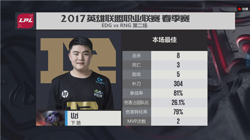 第四周第二日比赛,EDG和RNG均以2:1险胜LGD和GT,双方表现优异蓄势待发为3月5日的宿敌之战做足了准备。然而EDG队员变动磨合期不敌RNG全华班猛烈攻击,狂小狗UZI疯狂输出毫不留情。这支致力于打造全华班的战队没有让人失望,表现甚是强悍。UZI手中的EZ和小炮都展示出不凡的操作,第二局小炮更是与队友配合默契,以8杀3死5助攻304刀的成绩拿下MVP,伤害更是占团队输出26.1%,成为战队的主要经济与输出支柱,一度与EDG拉开很大的距离,RNG的强势下路是制胜的关键。我们来看一下第二把UZI小炮数据: