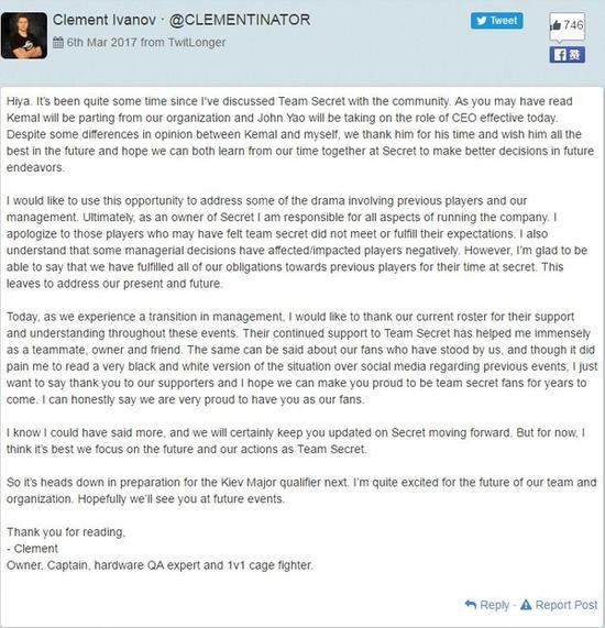 Puppey在长文中称:“我们即将要经历管理层的更换,我要感谢过去的工作人员为我们提供的支持和理解,他们一如既往的支持着Secret战队,无论是队友、老板还是朋友的身份都帮助了我很多。我敢说Secret的粉丝会继续支持我们,但是读了社交媒体上一些不分青红皂白的评论实在让我痛心。我只想感谢Secret的支持者,我希望你们会为Secret感到骄傲,我们有你的支持也很自豪。”