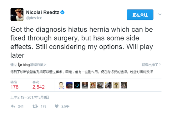 在昨天,dev1ce在个人推特上表示自己被查出来患有食管裂孔疝,虽然可以通过手术治疗,但手术会带来相应的副作用,因此他在考虑是否要接受手术治疗。