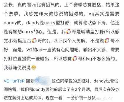 事情起因是粉丝向会长HunTeR提问表示似乎Dandy更适合队伍,随后会长Hunter对该粉丝作出回复,表示VG也曾试图挽留Dandy,但双方在薪资上没办法达到共识,现在看来一分钱一分货。如下: