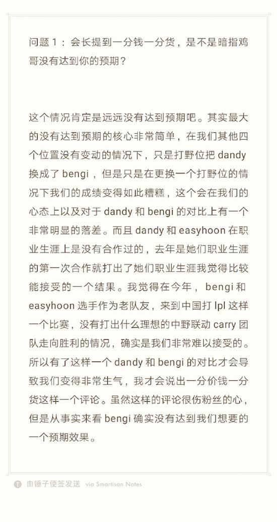 道歉完了,说一下具体的情况。虽说我说的是气话,bengi也很努力要融入,但是在结果上远远没有达到预期,而且在过程中,确实有一些bengi难以克服的问题,真的让我们非常失望。最直观的原因就是去年dandy和候爷职业生涯第一次联手打出了一个不错的效果让我们能够连续两个赛季确保季后赛席位,而本赛季作为两个老队友的他们并没有去年候丹组合打出的效果好,这样一个对比会让队伍内部觉得很失望。而从和中国选手的了解下,bengi确确实实难以在游戏内表达出他的具体思路想法,让其他中国队友很难配合到他。候爷这赛季表现也不如上个赛季,也是因为他在指挥上分担了更多的压力。