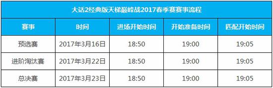 大话2经典版天梯巅峰战2017春季赛共有预选赛、淘汰赛和决赛三个阶段,其中预选赛将于明日开启,淘汰赛将于3月22日开启,决赛将于3月23日开启。