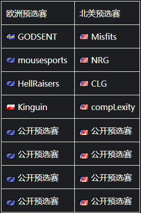 欧洲预选赛和北美预选赛将于3月26日同时开始,每个预选赛都有8支队伍。8支战队中的四支受主办方邀请而来,剩下的四支则为海选队伍。欧洲区的四支受邀队伍是GODSENT, HellRaisers, Kinguin以及mousesports,北美区则为Misfits, NRG, CLG和compLexity。