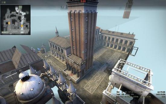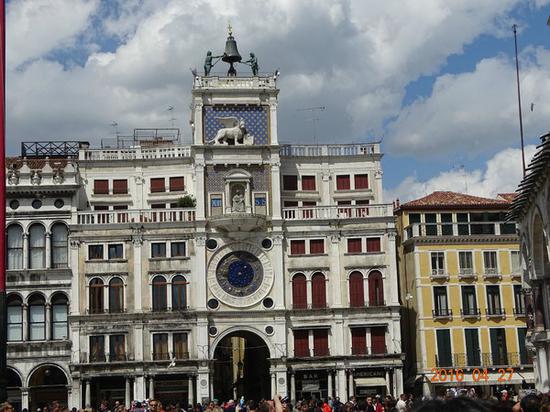 它位于圣马可大教堂的北侧,已有五百多年的历史,是威尼斯财富和荣耀的象征。时钟塔一层的拱门内是著名品牌商品购物区;钟楼的二层是十二星座和罗马数字构成了一个精美的表盘的时钟;三层中间是圣母圣子塑像,左右两侧分别由罗马数字和阿拉伯数字显示小时和分钟;再上面屹立着威尼斯徽章—双翼狮子,塔顶是一口钟和两个士兵敲钟报时。当然游戏里装饰只有一个小士兵站在上面了。