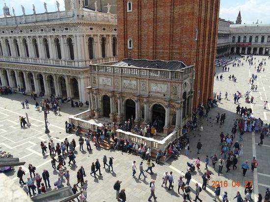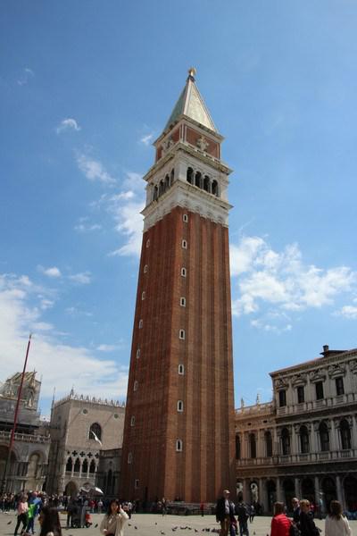 这座由红砖砌就、高98.6米、建于十五世纪末期的钟楼,既是威尼斯城市的坐标,也是广场建筑群空间构图的重心。如登顶远望,据说可以尽情观赏风光宜人的威尼斯城和潟湖全貌,甚至可以远眺美丽的阿尔卑斯山。可想而知,建造如此高度的钟楼,不是单纯瞭望,更重要的是让上帝的声音传到四面八方。