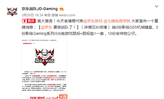 京东于昨日宣布:将与七煌电竞学院合作,联手创办电竞战队。并发布长微博进行公告。