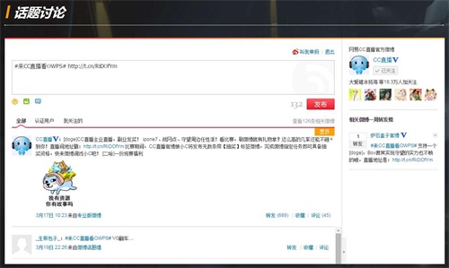 OWPS期间,观看CC直播不但能与线上水友弹幕互动,指点江山,还可以参与专题页上的微博互动,通过发送微博话题 #来CC直播看OWPS# 与微博上亿万观众一同分享赛事感受。